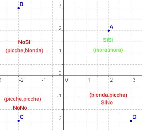 La coppia (x,y) identifica l'utilità di (Nash,Martin), sappiamo che entrambi attribuiscono valore a=3 : sedurre la bionda, b=2 : sedurre la mora, c=-2 : ricevere il "due di picche".